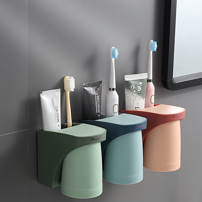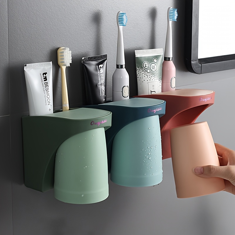1pc Nordic Style Magnetic Wall-Mounted Toothbrush Holder, No-Drill Plastic Bathroom Organizer with Waterproof Cup Sleeve for Couples