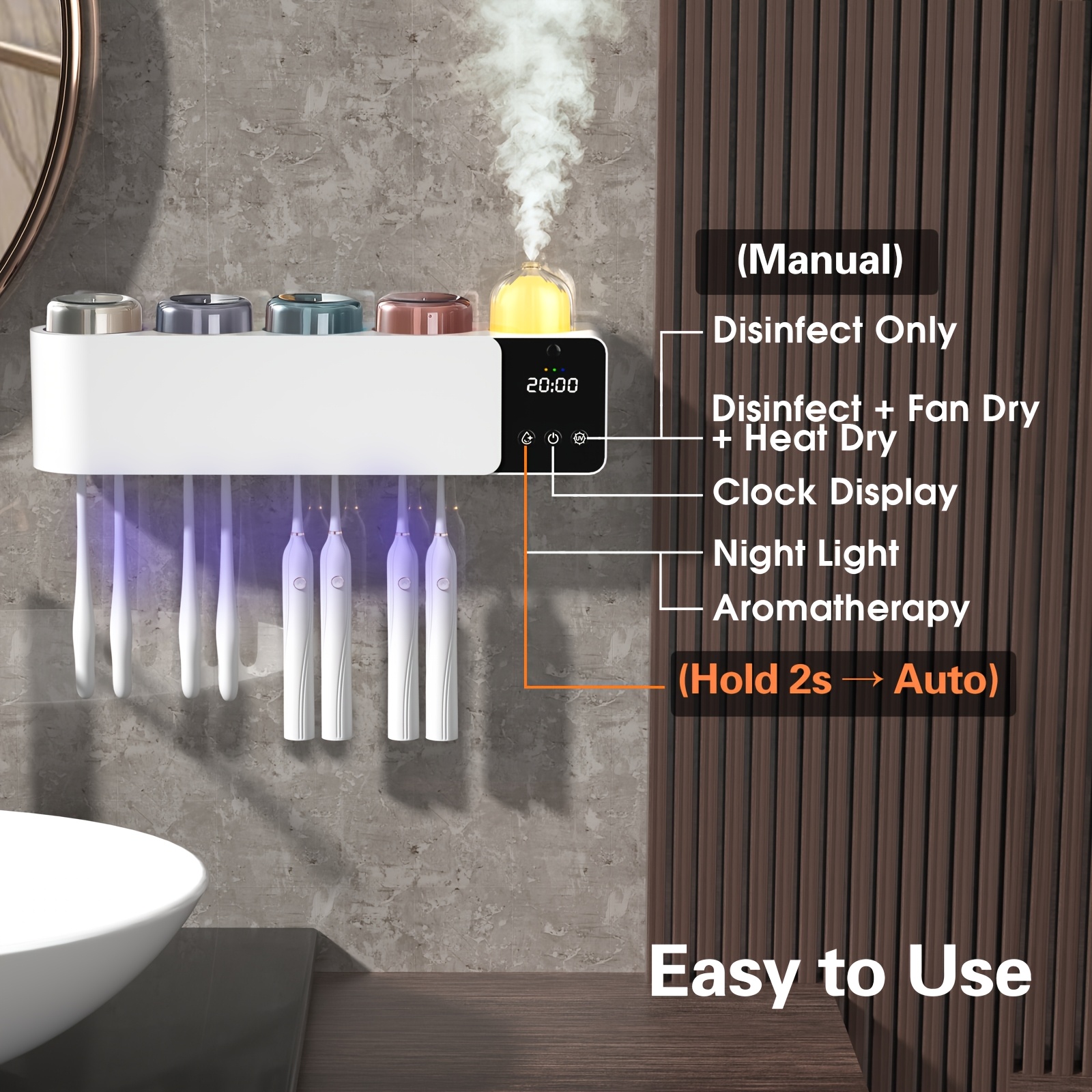 Toothbrush Holders with UV Toothbrush, Aromatherapy Diffuser & LRNight Light -4-Hour Smart Cruise Disinfection